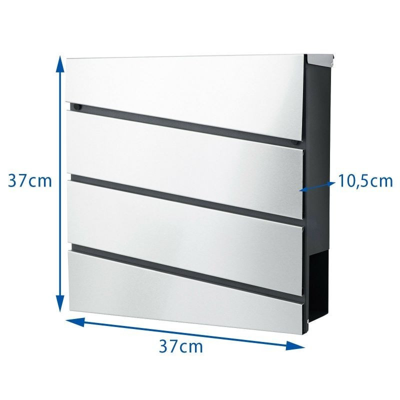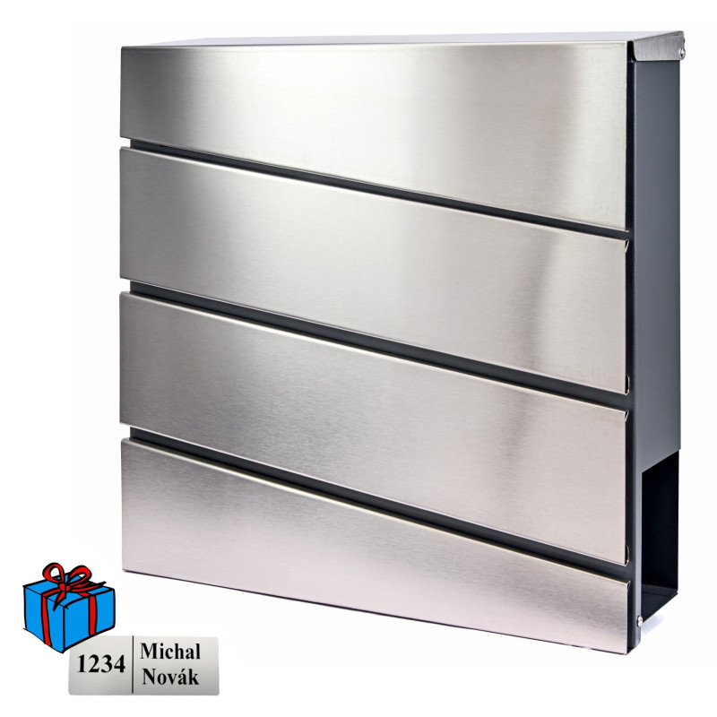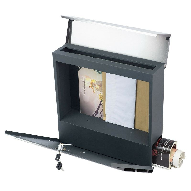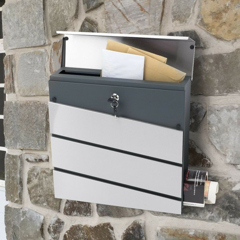 Poštovní schránka, kombinace nerezové oceli a antracitu. Díky použití vhodného materiálu je schránka odolná vůči povětrnostním podmínkám a bude Vám dlouho sloužit. Velikost schránky zaručuje bezproblémové přijetí velkého množství pošty. Vybavena další přihrádkou na noviny a větší letáky. Shora je veškerá korespondence velmi dobře chráněna před vlhkostí a deštěm. Kombinace nerezu a antracitu vystihuje momentální barevný trend oken a plotů. Schránka obsahuje montážní prvky v zadní části - pro ještě rychlejší a snazší montáž.