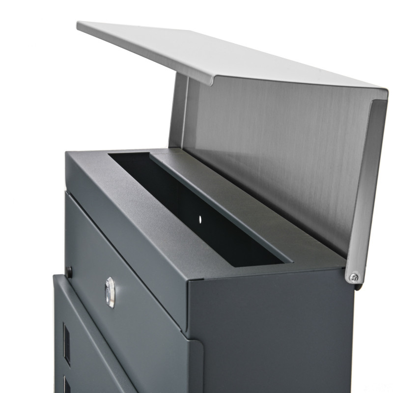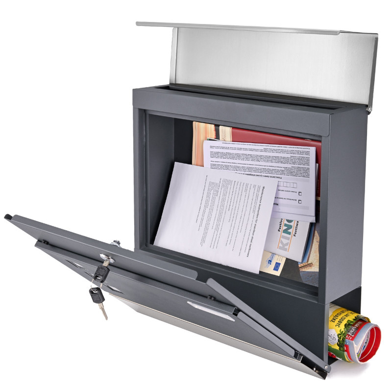 Jedinečný design - kombinace nerezu a antracitu, schránka s okénkem z čirého plexiskla, umožňující částečný průhled do nitra. Použitý materiál zajišťuje dlouhodobé a trvanlivé používání. Dolní část slouží jako box na noviny. Klapka schránky schrání poštu a zámek před deštěm. Čtyři otvory pro rychlou montáž. Součástí balení je montážní materiál.