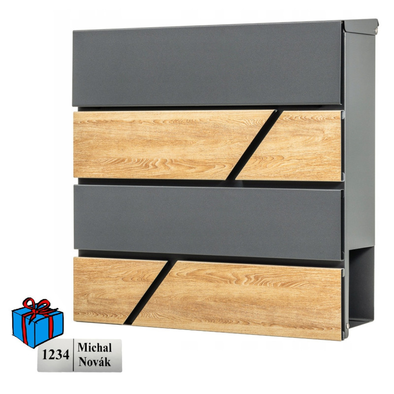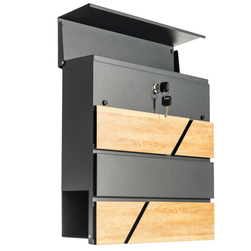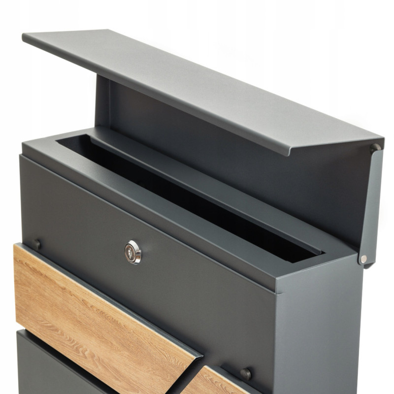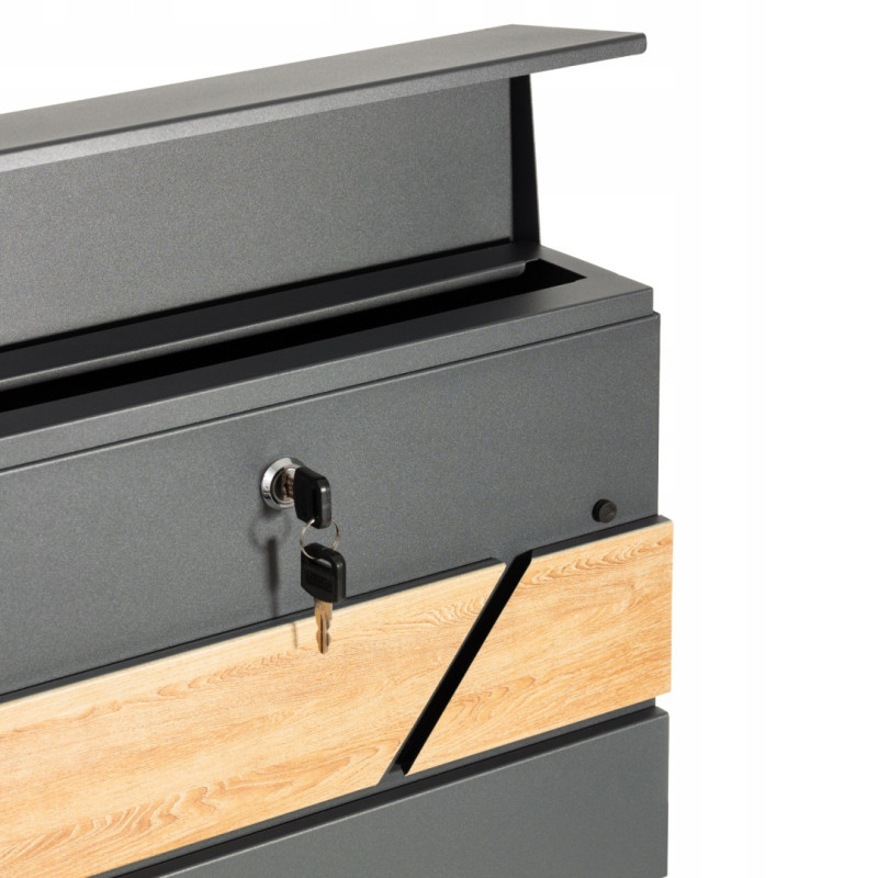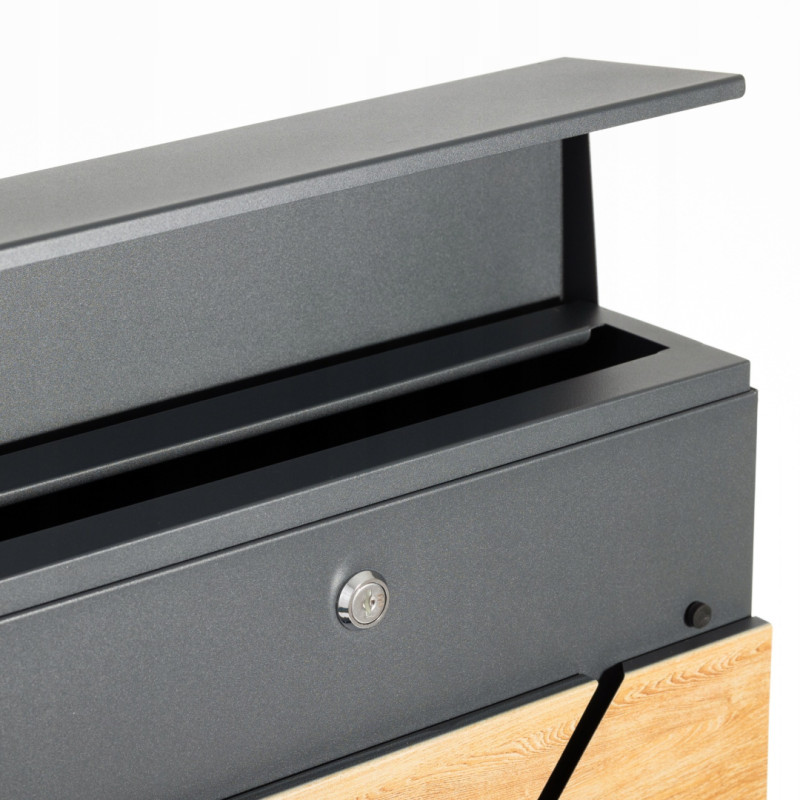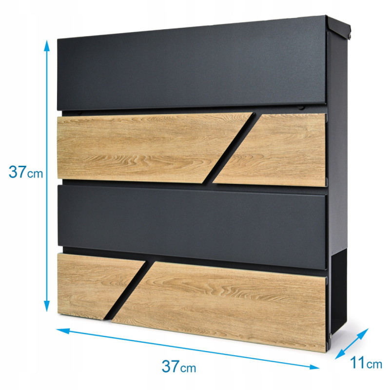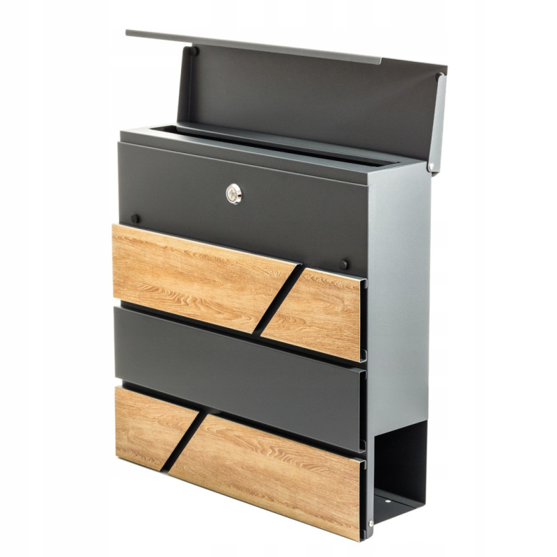 Kvalitní poštovní schránka vyrobená s jedinečným designem, který kombinuje antracitovou barvu s imitací dřeva. Schránka je odolná vůči povětrnostním vlivům. Byla navržena pro pohodlí uživatele as přihlédnutím k současným estetickým trendům. Je vybavena přídavnou přihrádkou na noviny a větší letáky. Horní kryt schránky chrání korespondenci před vlhkostí a deštěm. Sada obsahuje montážní šrouby, přičemž otvory jsou připraveny na zadní straně schránky – pro rychlou a jednoduchou montáž.