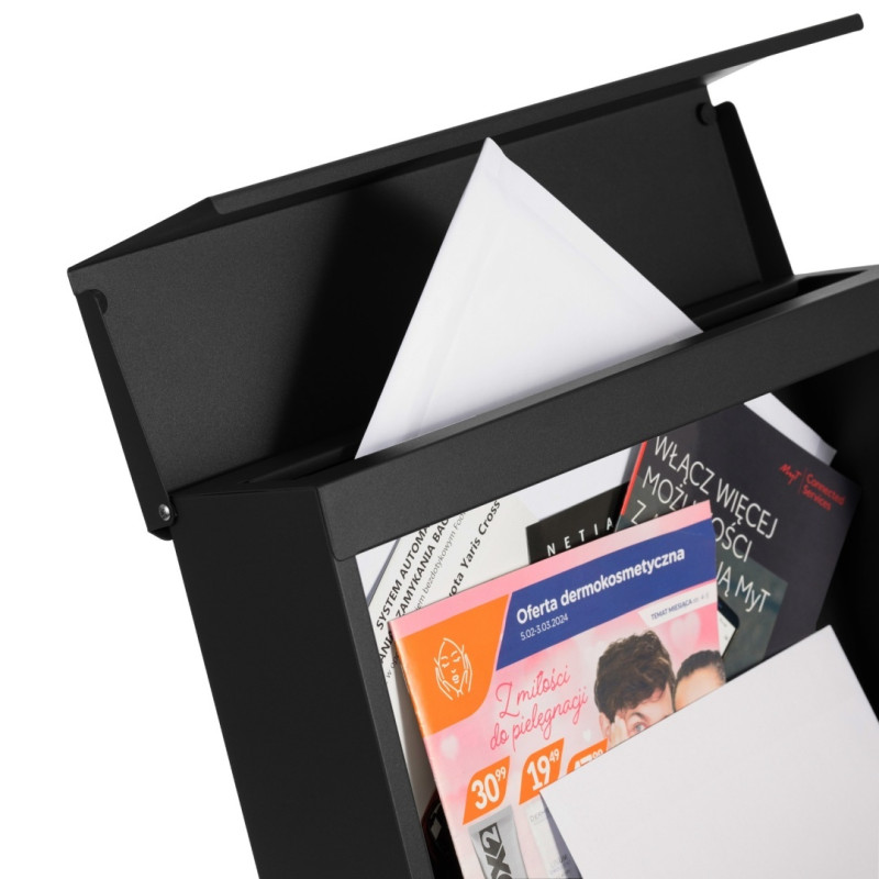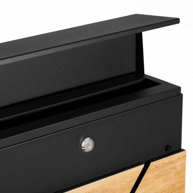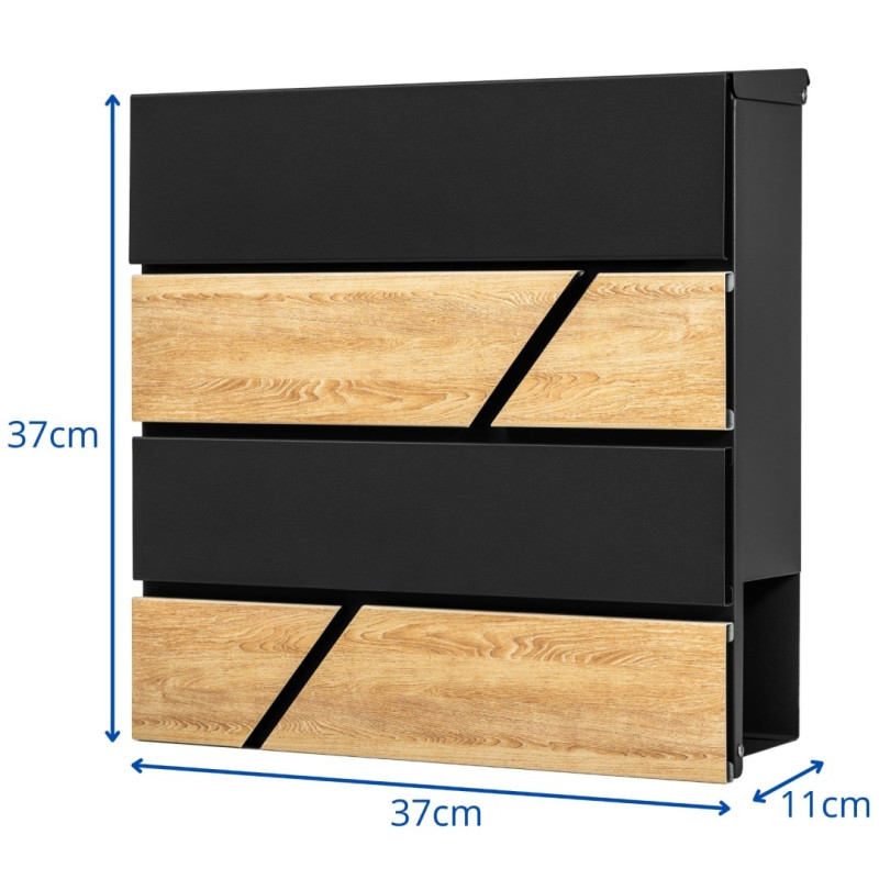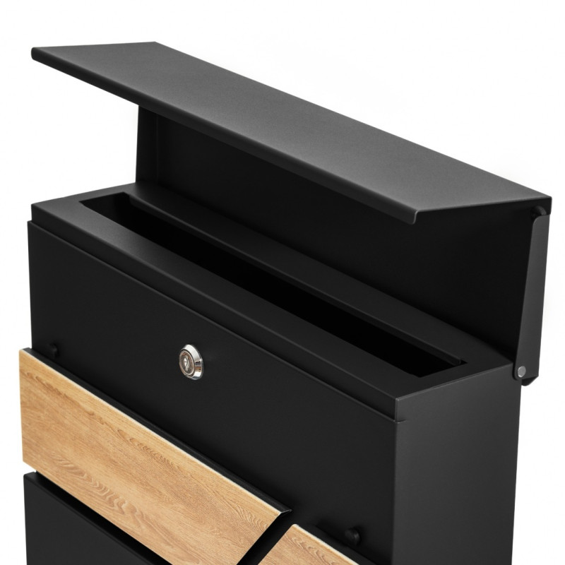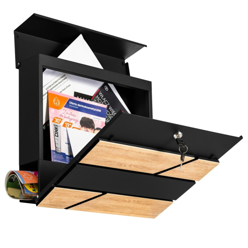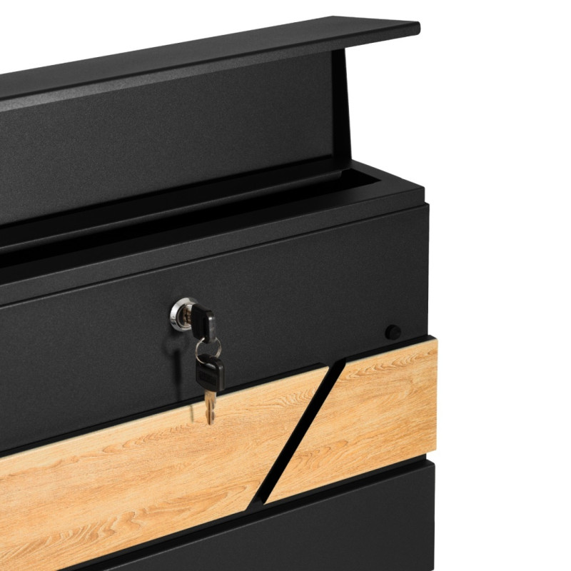 Poštovní schránka z pozinkované oceli, práškově lakovaná v černé barvě + imitace dřeva s dodatečnou přihrádkou na noviny.