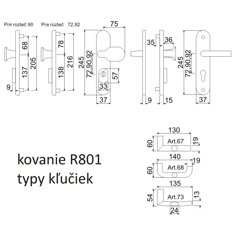 Rozteč 72, 90, 92 mm / vzdálenost osy rukojeti od vložky /