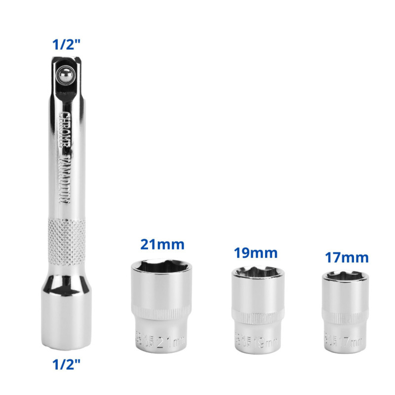 - 3 hlavice: 17 mm, 19 mm, 21 mm