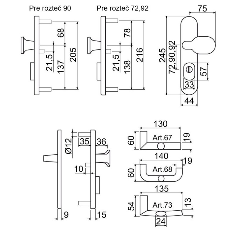 • Rozteč 92 mm: tloušťka dveří 60–75 mm