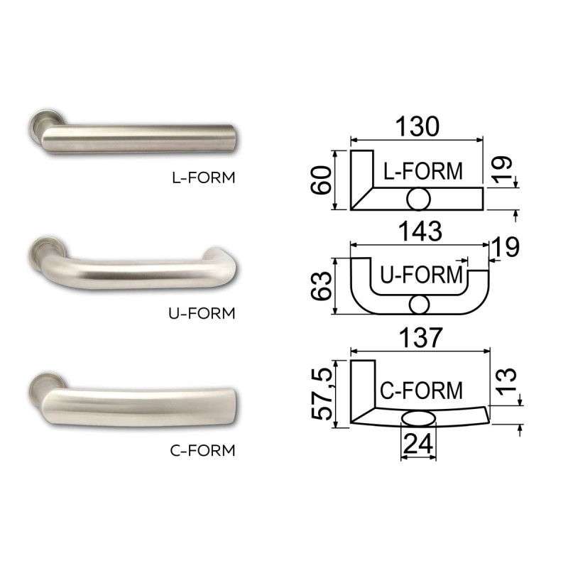 • Standardní klika ve tvaru „C-FORM“ – na požádání možnost provedení L-FORM nebo U-FORM - pokud máte zájem o jiný typ než C-FORM napište nám prosím do poznámky při objednání