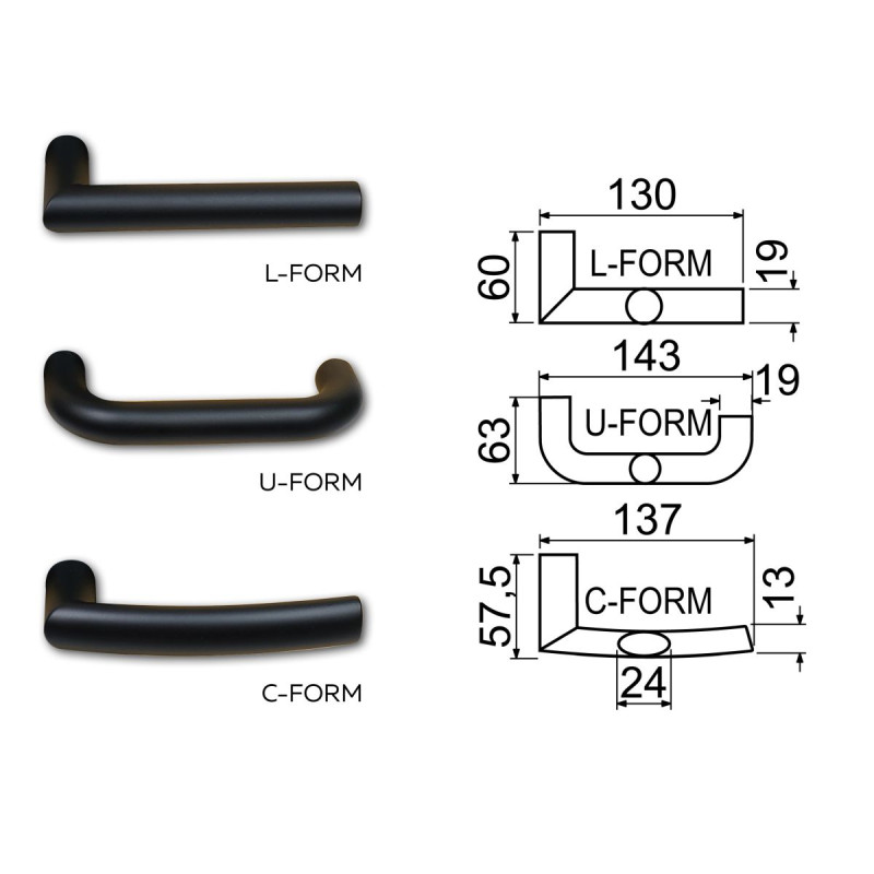 - Standardní klika ve tvaru „C-FORM“ – na požádání možnost provedení L-FORM nebo U-FORM (uveďte prosím do poznámky při objednávce).