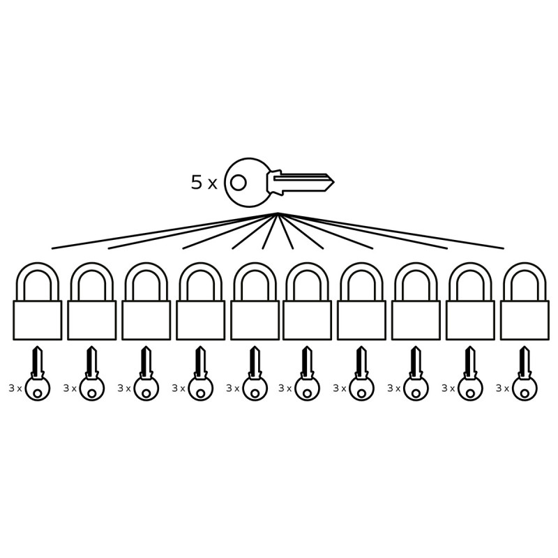 - Hlavní „zlatý“ klíč otevírá všechny visící zámky sestavy, ostatní vlastní „stříbrné“ klíče otevírají pouze svůj visací zámek