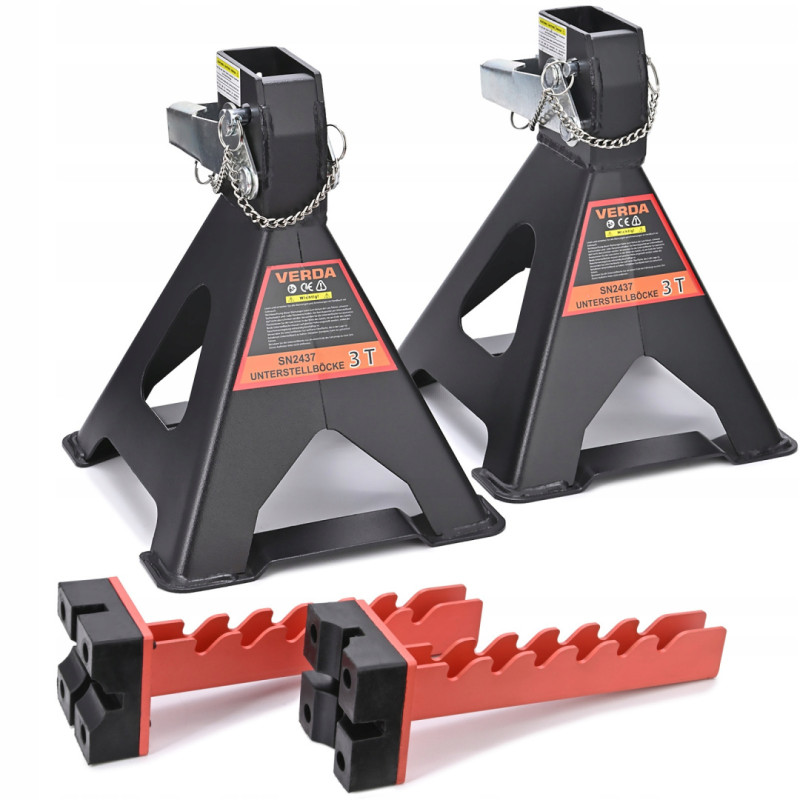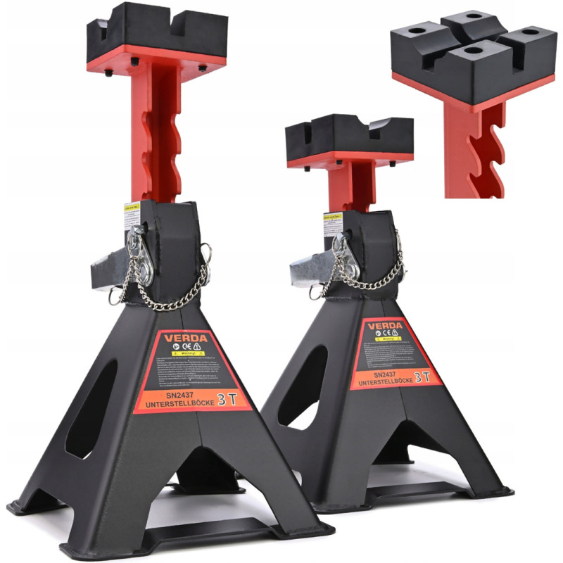 Sada dvou podpěr s nosností 3 tuny, s bezpečnostním kolíkem. Součástí balení je také velká ochranná guma.