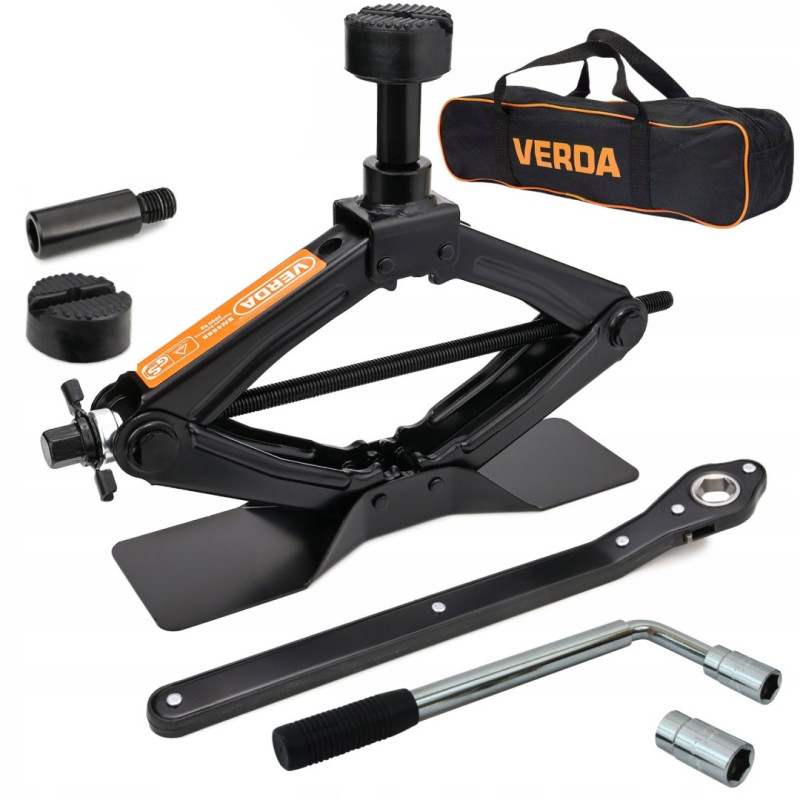 Profesionální trapézový zvedák do auta s nosností 2 tuny, s ráčnou, teleskopickým klíčem na kola a praktickým obalem.