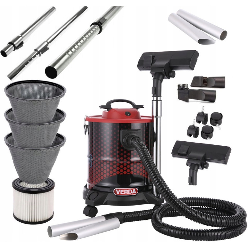 Elektrický vysavač na popel o výkonu 1650W, vybavený HEPA filtrem a látkovými filtry.